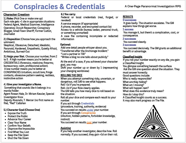 - A one-page RPG of supernatural investigation and hidden truths